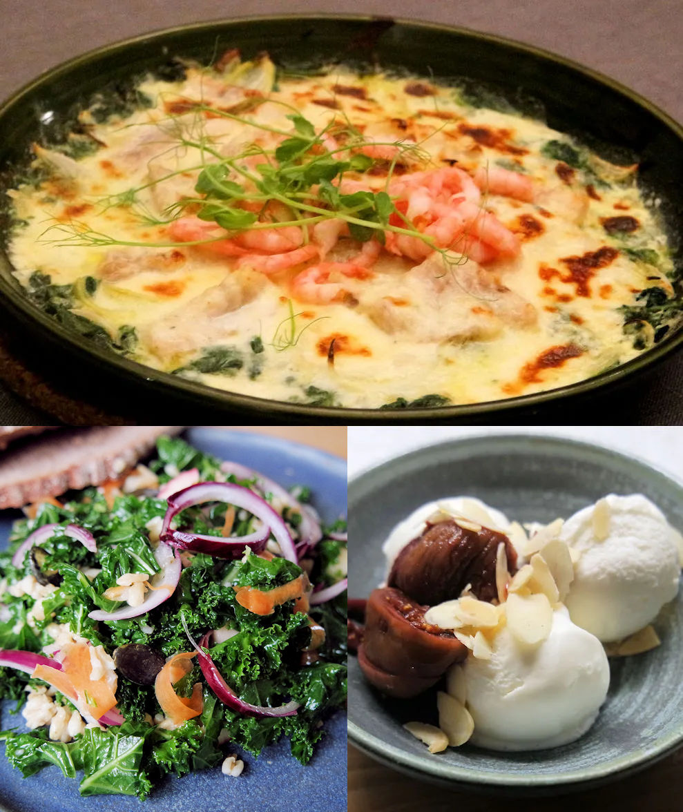 Små potatispajer med burrata, grönkålspesto och valnötter Ugnsbakad röding på bädd av grön sparris i hollandaise, selleri- och potatispuré med pepparrot och friterad grönkål Saffranspäron med mandel och konjaksgrädde