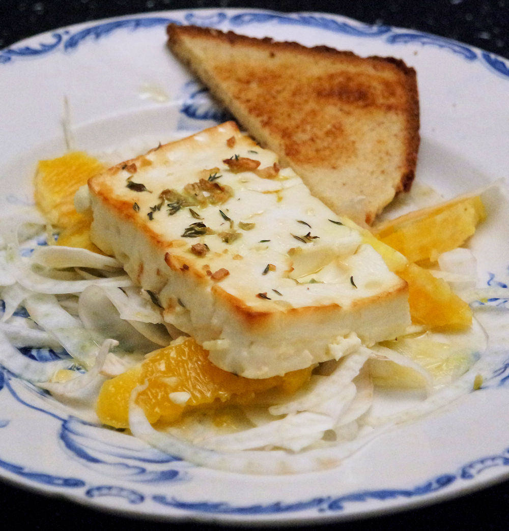 Sätt ugnen på 200 grader. Dela varje ost i 2 delar. Lägg ostbitarna i en ugnsform. Ringla över lite olja, hackad vitlök och smulad timjan. Vänd formen efter 10 min. och låt osten baka i ytterligare 10 min. Hyvla under tiden den ansade fänkålen tunt med en mandolin. Fördela fänkålen på 4 portionstallrikar. Skala och skär apelsinerna i hinnfria klyftor som läggs på fänkålen, några droppar olja, salt och peppar. Slutligen den bakade osten på toppen. Servera ev. en rostad skiva rågbröd delad i 2 trekanter till förrätten.