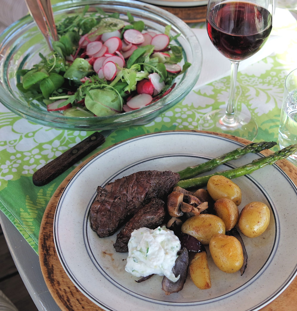 Putsa köttet från synliga senor. Blanda marinaden. Lägg köttet i en plastpåse och slå i marinaden. Knyt till, lägg i kyl 2-3 timmar i en bunke (påsen kan läcka). Låt köttet rinna av. Skär det i drygt cm-tjocka skivor. Förbered tillbehör och grill. Grilla 3-4 min på var sida. Salta och peppra under grillning. Lägg gärna den nykokta potatisen och annat grönt vid sidan om på grillen.