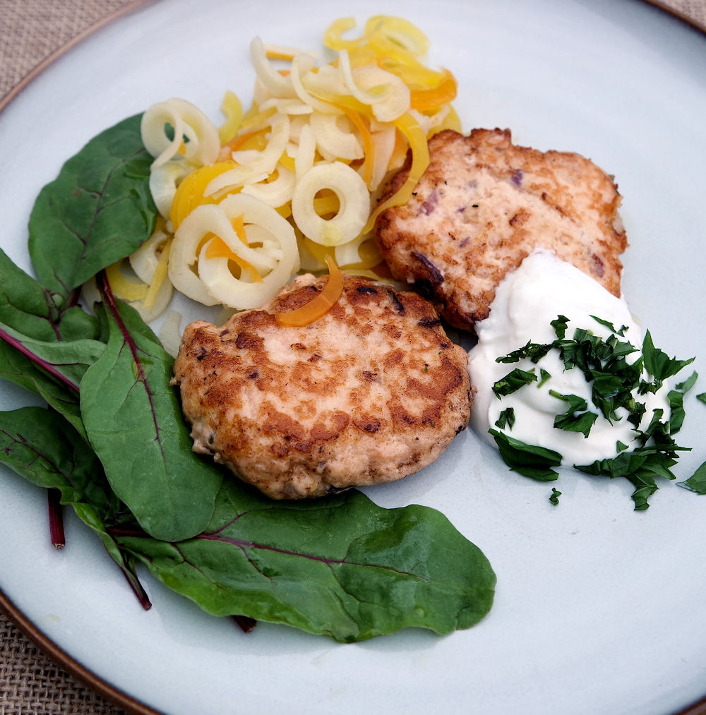 4 port. ca 500 g laxfilé eller fryst laxfärs 1 liten rödlök 2 msk kapris 1 äggula 2 msk senap saltvitpeppar smör till stekning