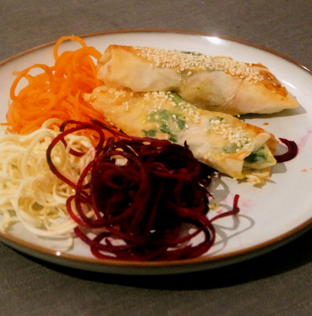 Tina laxen och spenaten om den varit fryst. Strimla, salta och peppra den lätt. Fräs den kort i lite flytande smör-rapsolja. Ta fram och förbered filodegsbladen. Täck över dem tills de ska fyllas (de torkar lätt). Sätt ugnen på 175° (varmluft). Dela filodegsbladen mitt itu. (8 st) Lägg lite avrunnen spenat och strimlad lax nedtill på varje fyrkant (det ska räcka till 8 knyten). Pensla med lite smörolja runt kanterna på varje blad. Rulla bladet ett varv och vik in kanterna. Fortsätt rulla till ett knyte. Upprepa samma sak med de återstående bladen. Lägg knytena på plåt med bakplåtspapper. Pensla med uppvispat ägg och strö över lite sesamfrön. Grädda i 8-10 min. Servera knytena nygräddade med sallad eller strimlade/svarvade grönsaker, kokt ris och en kryddig dipsås med asiatisk touch.