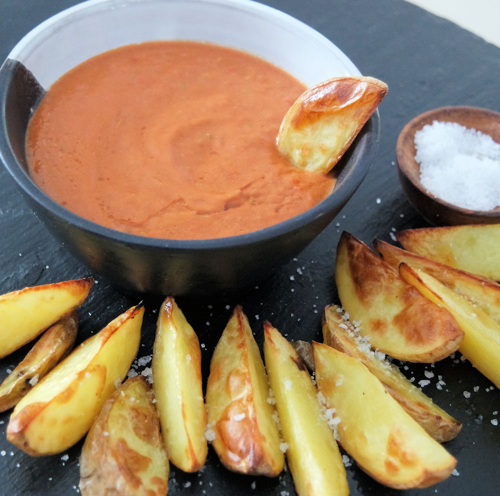 Sätt ugnen på 225 grader. Skölj, dela och strimla paprikorna. Sätt in dem i ugnsform för att grillas 5-8 min. Tvätta potatisen och klyfta den. Häll olja i botten på en ugnsform. Lägg i klyftorna, vänd runt dem så att de blir oljiga. Salta lätt. Sänk ugnsvärmen till 200 grader och sätt in potatisklyftorna i ca 30 min. Fortsätt nu med såsen. Smula sönder brödet och lägg det i en bunke. Häll över vinägern. Låt stå ca 5 minuter tills brödet dragit åt sig vinägern. Skala och hacka vitlöken. Lägg den grillade paprikan i mixer/stavmixer tillsammans med brödet i vinäger och vitlöken. Mixa det hela kort. Tillsätt tomatkrosset och kör blandningen till tjock såskonsistens. Smaka av såsen med chilipeppar och salt. Tillsätt lite olja i taget under fortsatt mixning tills det blivit en tjock sås. Doppa de rostade potatisklyftorna i såsen.