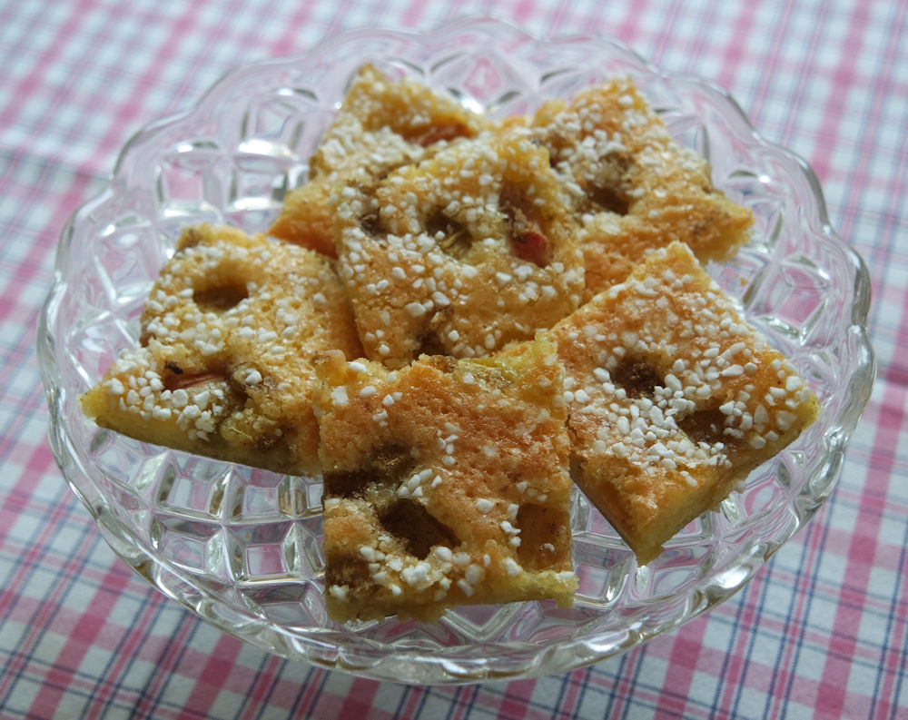 Sätt ugnen på 160° (varmluft). Lägg ett bakplåtspapper i en ugnsform ca 20x30cm. Smält smöret och låt det svalna. Rör ner socker, ägg och mjöl i smöret. Blanda till en slät smet. Skala och skär rabarbern i cm-stora bitar. Blanda rabarbern med socker och kardemumma. Häll smeten i formen och fördela rabarbern över. Strö till slut på lite pärlsocker. Grädda mitt i ugnen i 20 minuter. Känn med en sticka, kakan ska vara lätt kladdig i mitten. Låt kakan svalna och skär den sedan i rutor.