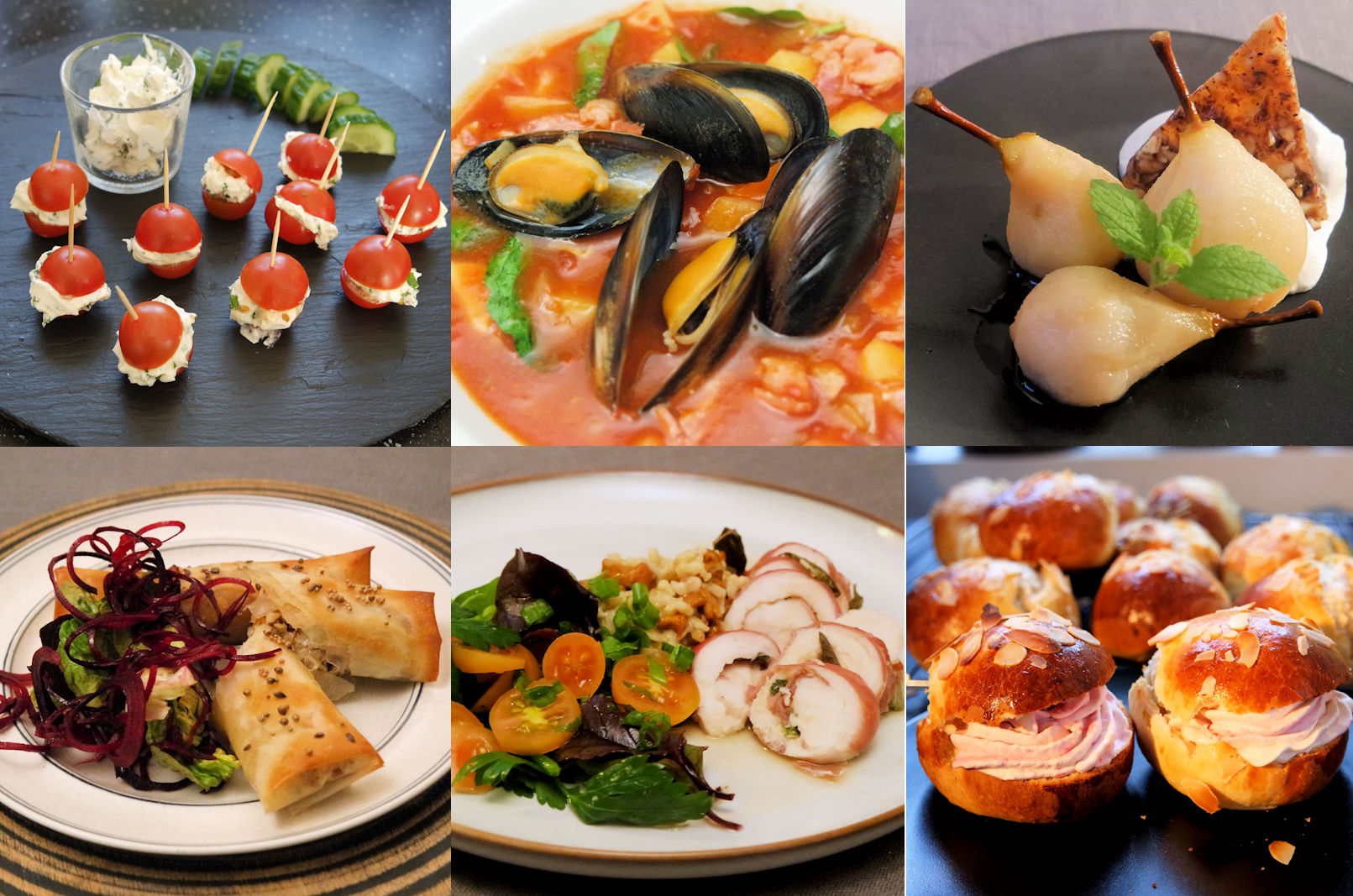 Små potatispajer med burrata, grönkålspesto och valnötter Ugnsbakad röding på bädd av grön sparris i hollandaise, selleri- och potatispuré med pepparrot och friterad grönkål Saffranspäron med mandel och konjaksgrädde