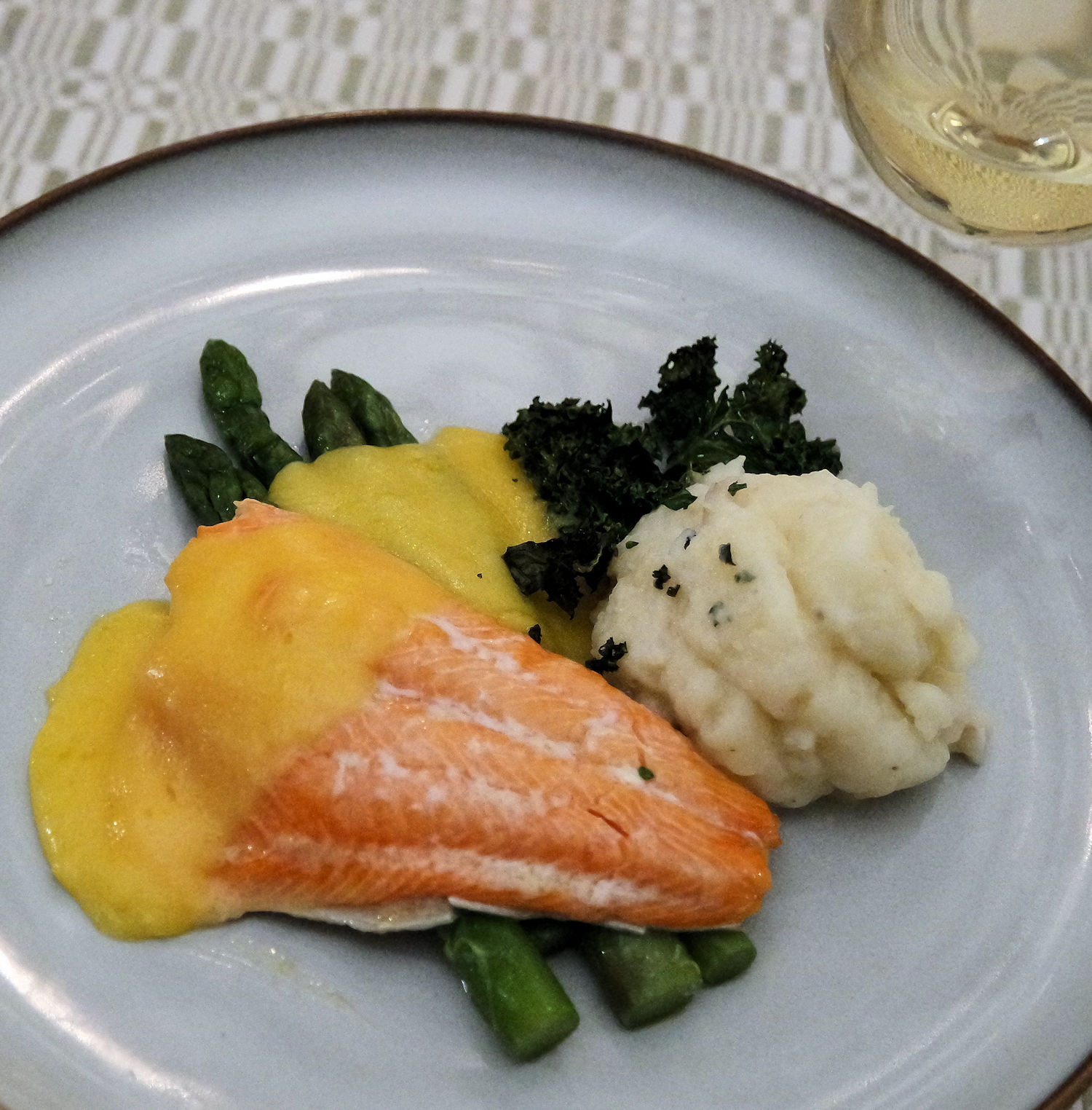 Sätt in fisken i ugnen 8-10 min. Den ska vara 50-55 grader innan den tas ut och se nästan fast ut. Laga under tiden hollandaisen.
