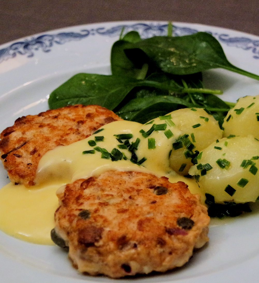 Hacka laxen fint. Skala och hacka löken Blanda lax, lök, kapris, äggula, senap, salt och vitpeppar. Rör så att smeten håller samman. Forma små biffar. Stek dem i smör 2 min/sida Servera små smör/gräslöksslungade potatisar och en krämig hollandaise till.