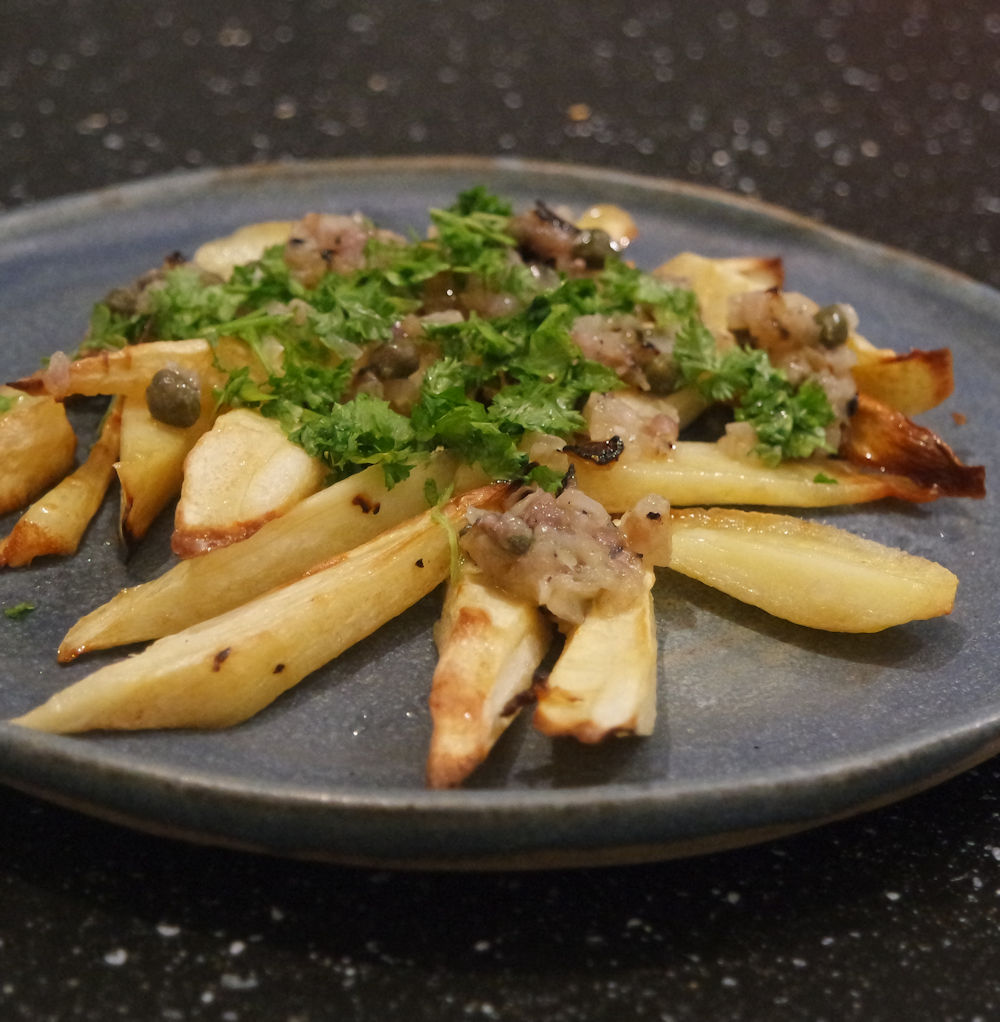 4 port. ca 400 g palsternacka 2 msk olja (1 msk till rostning och 1 msk att fräsa lök i) lite salt 1 mellanstor gul lök 2 sardellfiléer (ansjovis går också bra) 2 tsk kapris svartpeppar hackad persilja