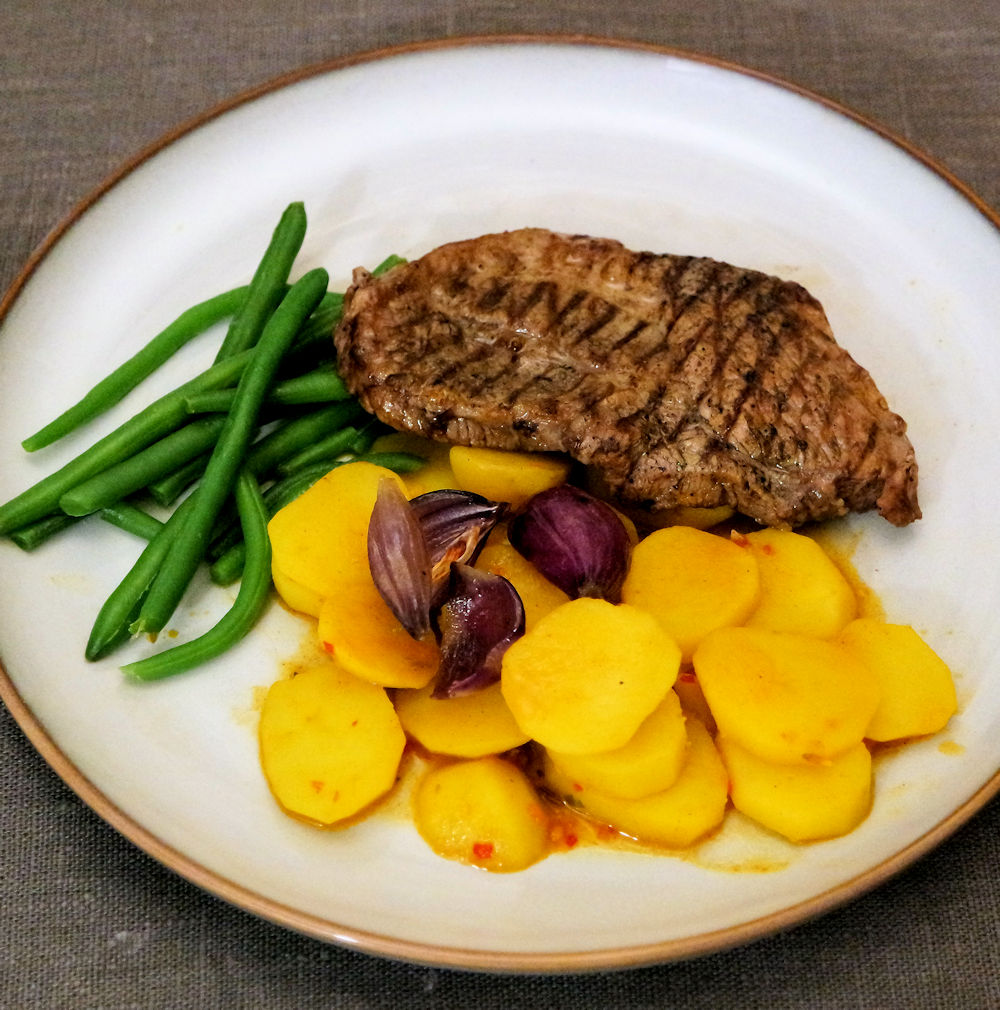 Rostade tunnbröden, skurna i 3 cm breda remsor, helt kort i het stekpanna eller ugn om den redan är varm.