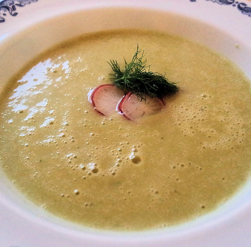 Potatis och purjosoppa 4 port. 1 purjolök 1 vitlöksklyfta smör 500 g potatis (helst mjölig sort) 1liter vatten 2 tärningar kyckling- eller grönsaksbuljong salt och peppar 2 dl gräddmjölk eller crème fraiche hackad gräslök